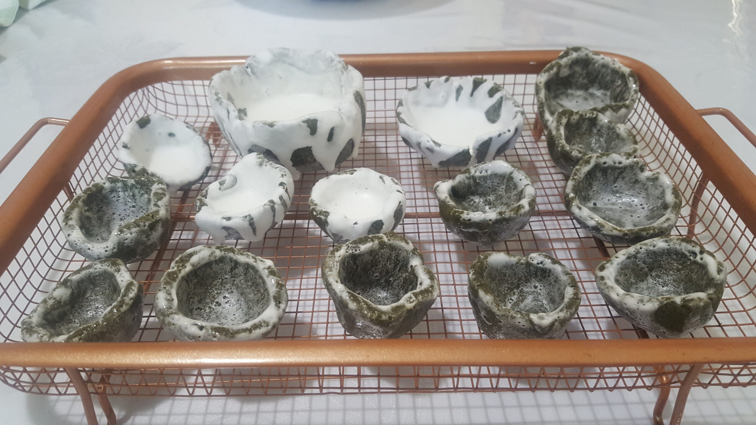 I whipped up a batch of icing (egg white, icing sugar, lemon juice) and dipped my little clay cups in as a potter would use a ‘slip’. When I took them out I rested them on a wire mesh. Later that night I re-whipped the glaze and poured it over the top of a few of them, just to see how it would turn out.
