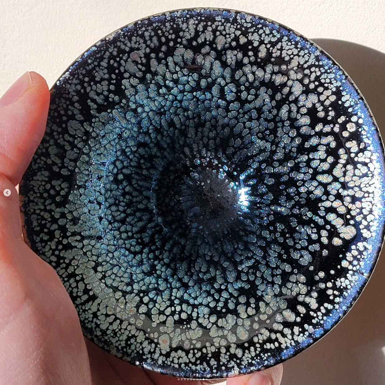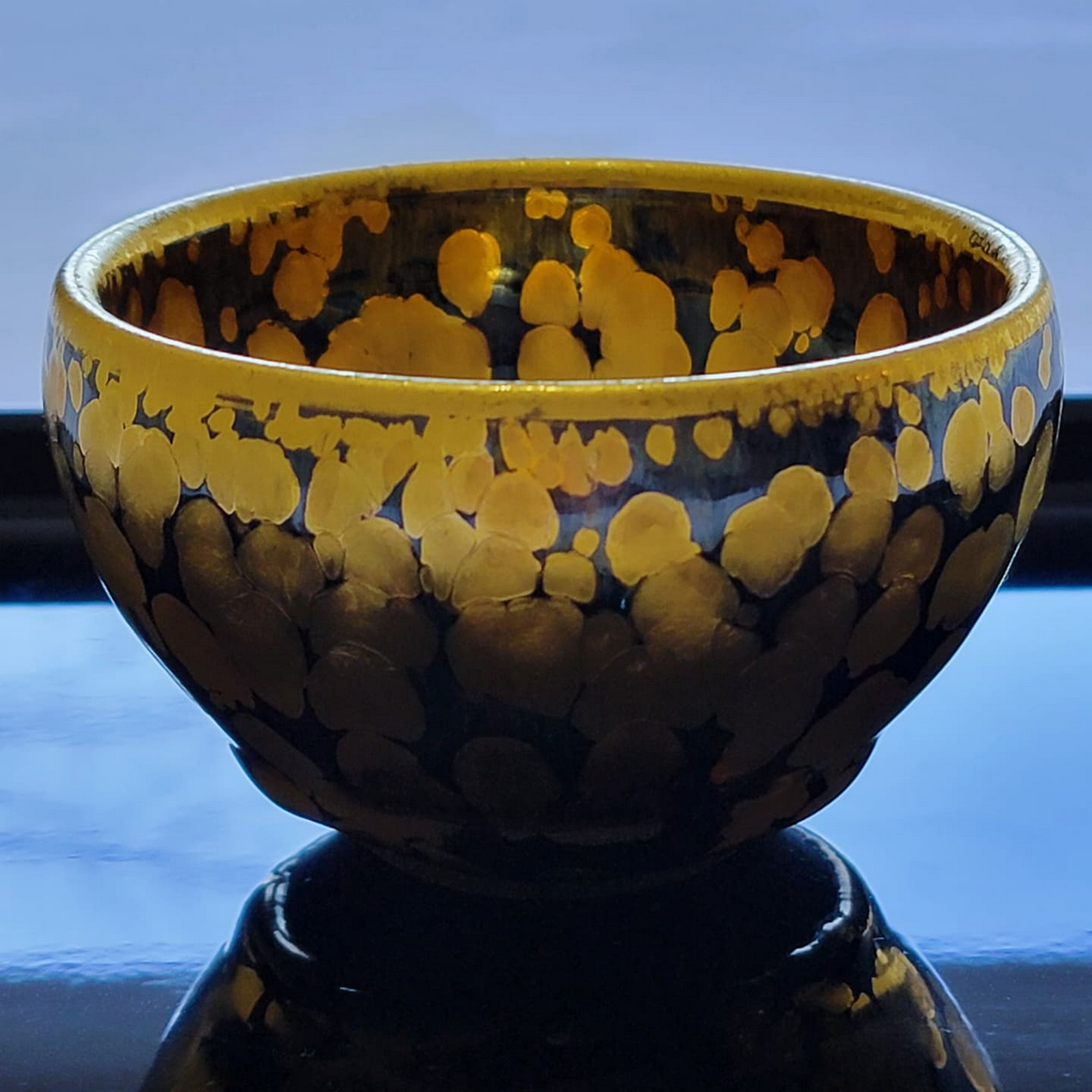It seems my favorite style of Jianzhan is called Yóu dī (Oil Droplets / Oil Spots) which is when there is an abundance of iron in the glaze, which accumulates as the glaze cools, forcing the iron to ‘pool’ in spots. It would seem that my Taiwanese temmoku bowls are made in the style called ‘tea dust’ in which gold powder is added to the cooling glaze, giving a very fine, shimmering dusty appearance. Another style is called ‘tortoise shell’ — looking to me nothing like a tortoise shell, more like leopard? a black base with large bands of pooling yellow in wavy patterns (maybe I haven’t seen enough tortoises), but I almost bought a tortoise shell teapot last year not knowing what it was!