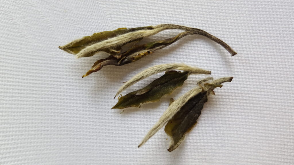 A great Mu Dan is picked with the silver needle and first leaf. The vast majority of this Mu Dan is just that — but as you can see in the picture above the pickers are not infallible!