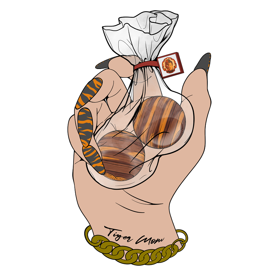 There’s an instagram account I follow that draws ‘SFW NSFW’ — a concept I really like. That’s @buboossenchan incase you wanted to visit. She has various videos about interacting with bags of marbles, a concept I have yet to touch on. Circumstantially, finding that account had a lot to do with this image. The name ‘Tiger Mom’ was the final step, and had nothing to do with shaping the image at all. The bag of marbles became a bag of tiger-eye gemstones, which turns out, are quite hard to draw. One early concept was going to be a tigers head with the bag of marbles in its mouth, but then a customer I showed the concept to mentioned tigers being a bit of a branding cliche these days, which I agreed, and thus retreated from that idea. I took some photos of my hand in different poses (chose this one), traced it out digitally, and the rest of the picture is built from there.